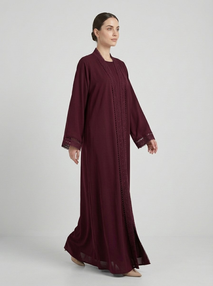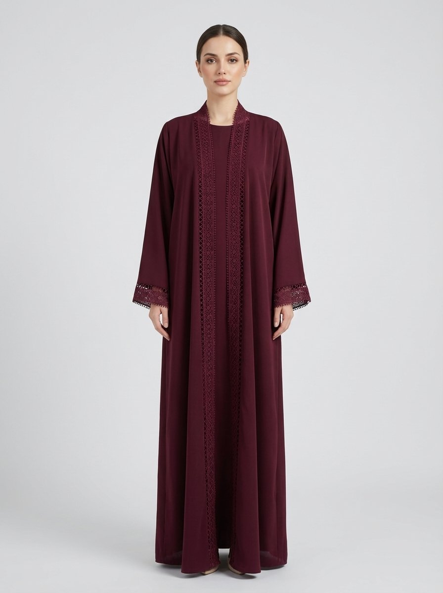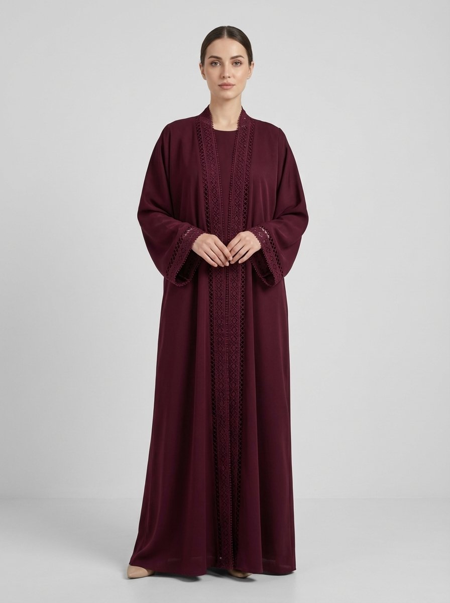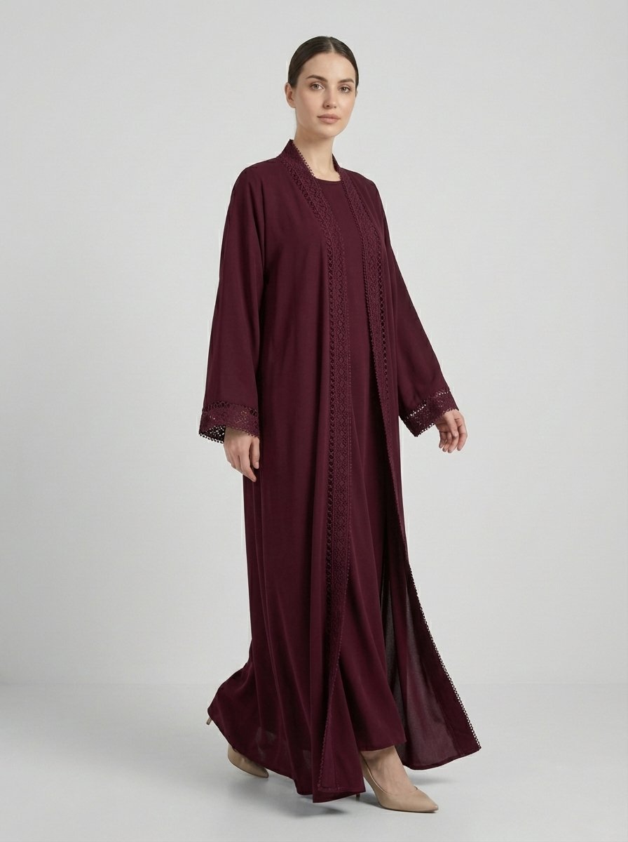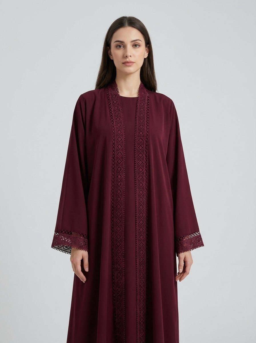 Burgundy Geometric Lace Trim Open Front Abaya