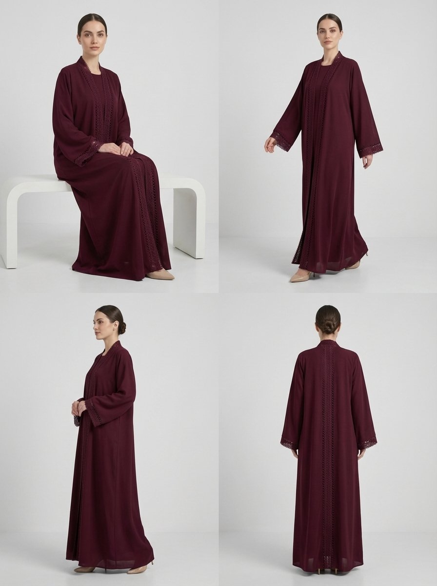 Be the first to review “Burgundy Geometric Lace Trim Open Front Abaya”